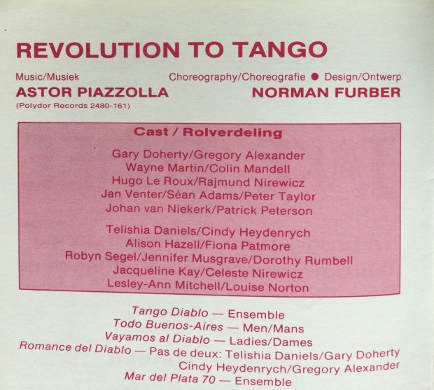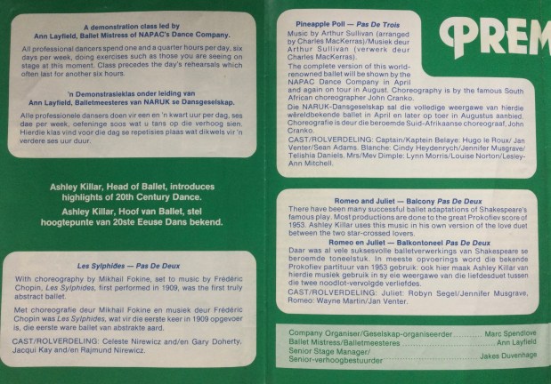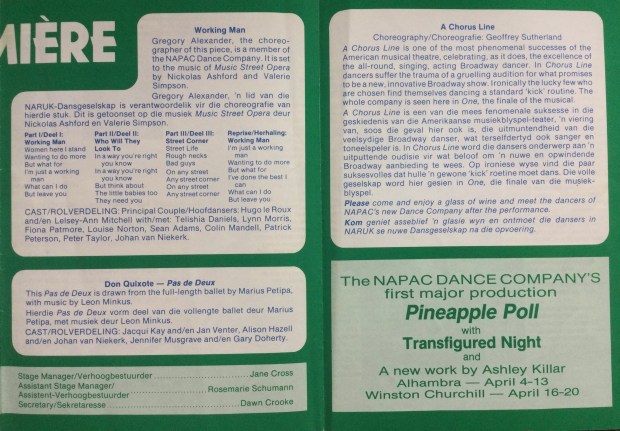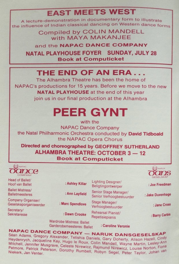 In 1984 the Natal Performing Arts Council, with a view to forming an entirely new dance company, invited me to mount a programme of four ballets on the existing Napac Ballet Company. The show was performed at Durban’s Alhambra Theatre, the company’s long-time home.