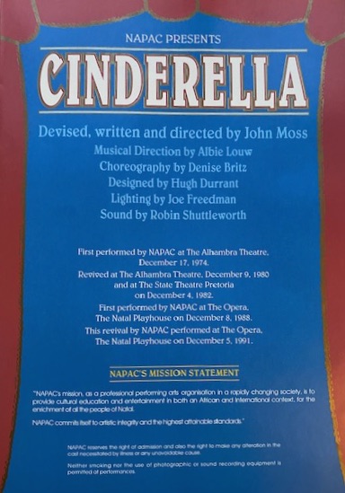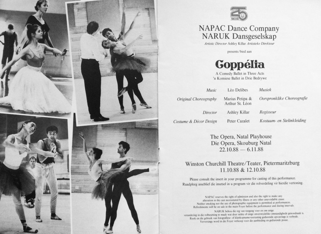 Coppélia made a re-appearance at Pietermaritzburg’s Churchill Theatre 11&12 Oct. & at the Natal Playhouse Opera 22 Oct – 6 Nov., and the NDC dancers appeared in the musical Cinderella (staged by John Moss) at the Natal Playhouse Opera Theatre 8 December 1988.