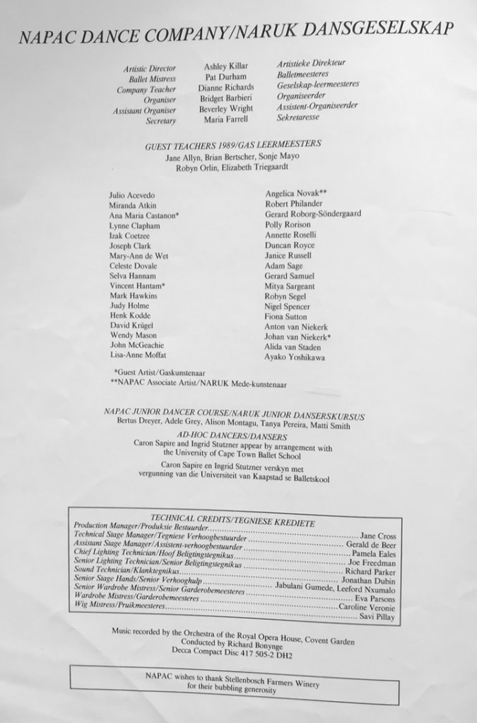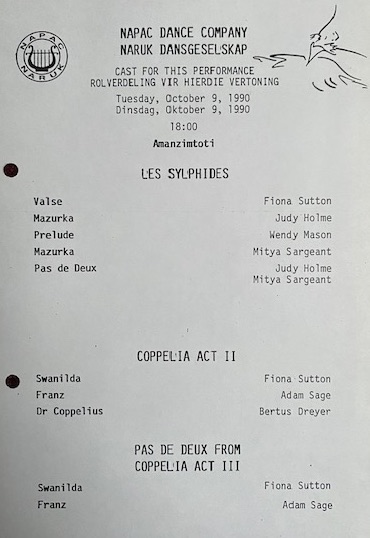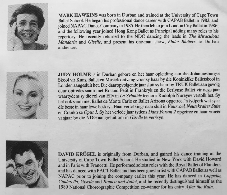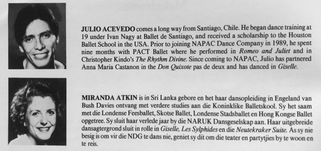 Giselle Natal Playhouse Opera 11,15,16,18,21,22 July and 20,21,22 October Churchill Theatre Pmb., 3-6 August, Sand de Plessis, Bloemfontein 19-23 Aug. I do have a video recording of our Giselle, and hope to add it here in due course. Meanwhile, see the slideshow below (use the arrows either side).